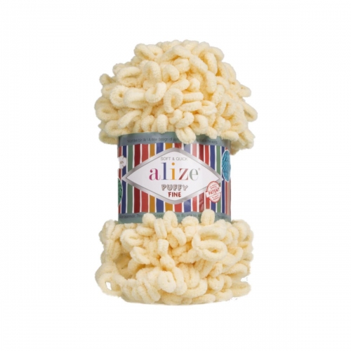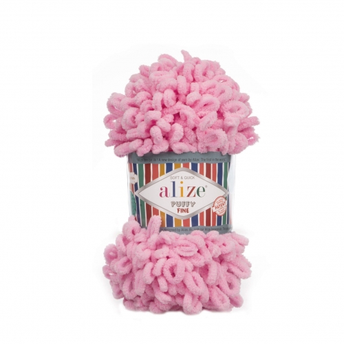 Пряжа Puffy fine от Alize созданная из 100% полиэстера, гипоаллергенна, подойдет для вещей и аксессуаров для самых маленьких детей. Вязать можно пальцами или на больших спицах, пушистая нить формирует ровное мягкое полотно, приятное к телу. Сама пряжа представляет собой основную нить, на которой размещены зафиксированные петельки длиной 2,7 см., равномерно расположенные по длине нити.